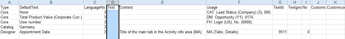 Information on user interface items that use the text: Field names: Fixed catalog entries: Field help: Prerequisites:The mm_dbstr.txt and mm_fixcatno_custom.txt containing the referenced text table entries (curly brackets, last entry) must be present in the ..\system\db directory.The field help must be present in the database. If a text is referenced by more than one element, all occurrences are output separated by a semicolon. |