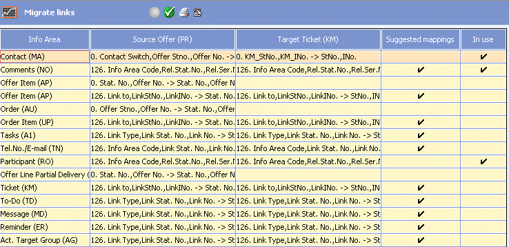 A list of all links that exist in the source info area is displayed, along with suggestions for corresponding links in the target info area. The In use column displays which links are actually used. The Suggested mappings cell is enabled for those mappings that were suggested by Aurea CRM. If you change the mapping manually, the tick is removed from this cell.
