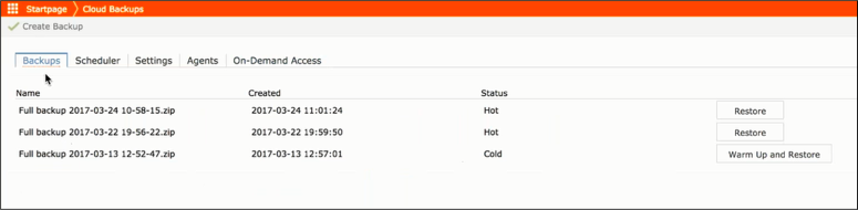 The Cloud Backup page (see the screenshot below) provides the following tabs: