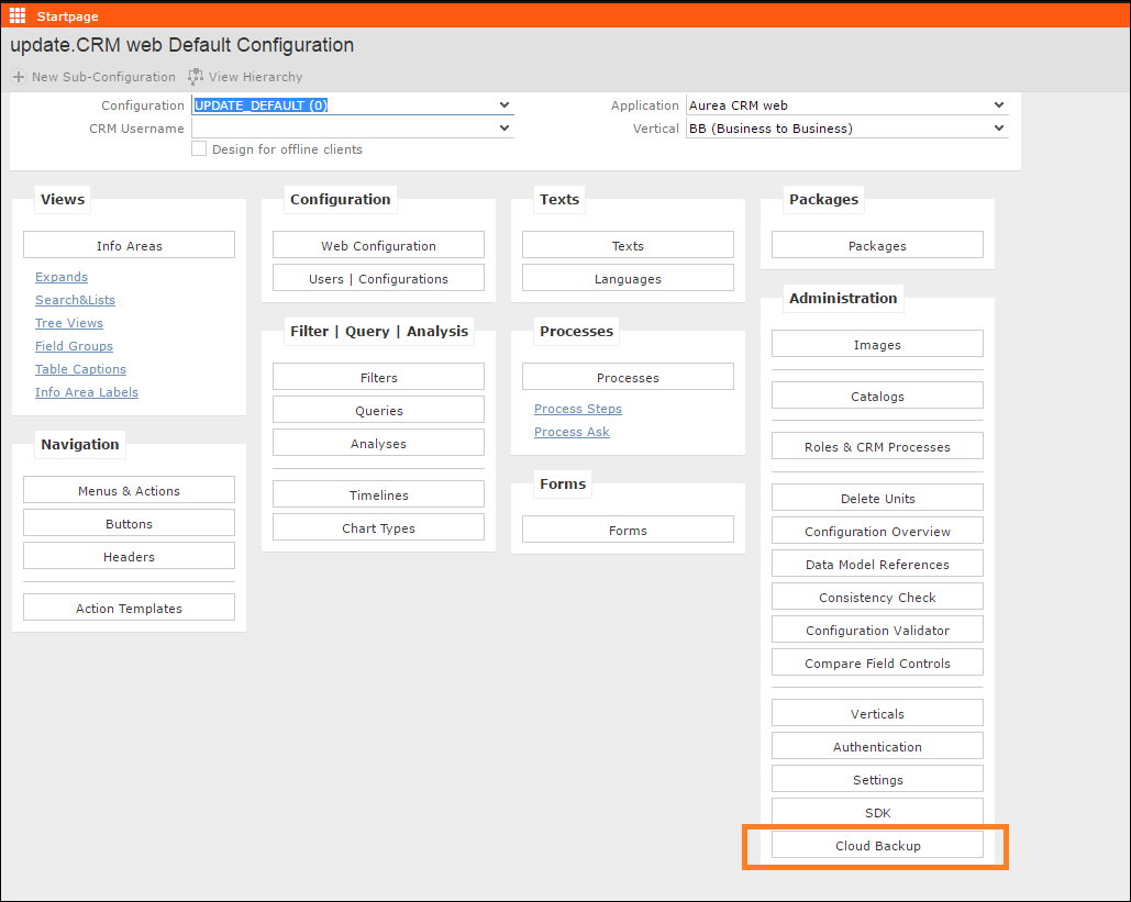 This Enterprise only feature allows you to configure the backup and restore services from the CRM.Designer interface. The following screenshot shows the Cloud Backup option in the designer.