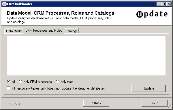 Note: Check Fill temporary tables only to only fill the temporary tables without updating the CRM processes and roles in CRM.Designer. This allows you to verify the changes before actually modifying existing data. - Click Update.