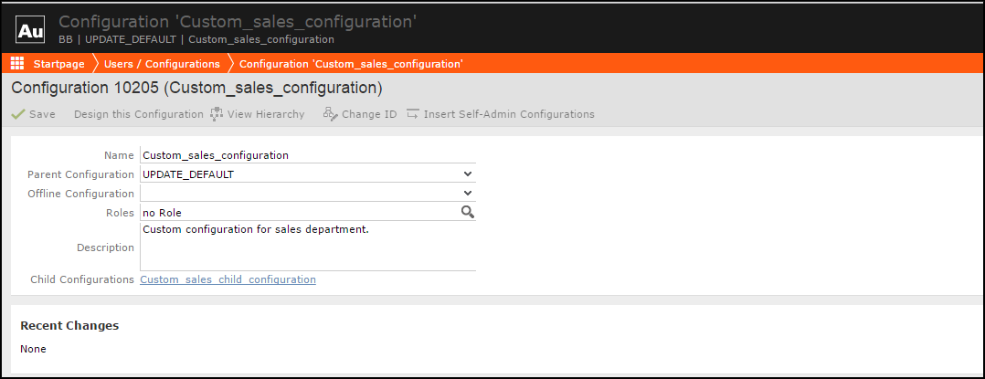 The edit configuration feature allows administrators to change name, parent configuration, roles and child configuration for a user.
