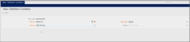 - Select the required date in the Value1 field. The number of fields to be populated again depends on the type of the operator. For example, if you select the operator between, then you have to specify two dates to select the activities that start in this date range.