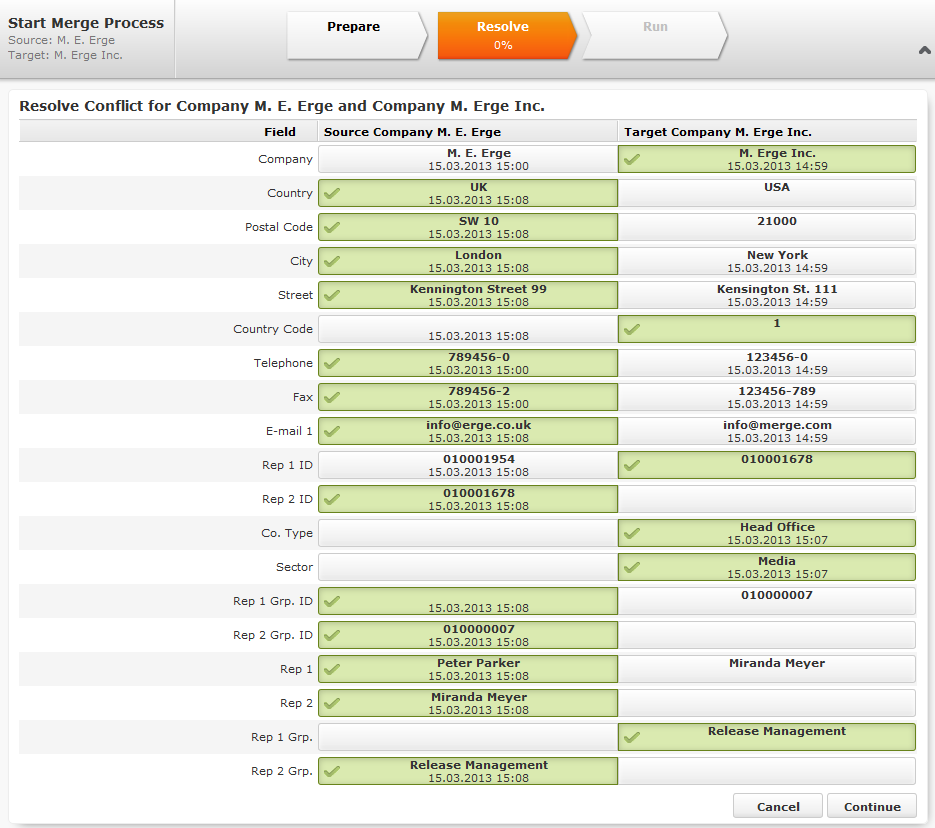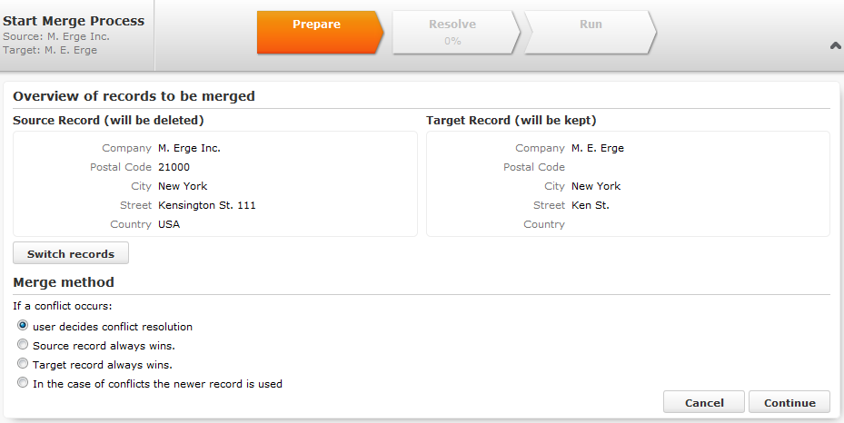 - If child records have been added for both the source and target record and these also contain identical or similar data, these also need to be merged. Click on Continue to merge each child record. The option selected for the parent record is also applied to the child records.Note: Your administrator can determine whether all fields are listed, or only those where the contents differ. If only the fields that differ are displayed, child records may be listed without any fields - in this case, the contents of the fields in both records are identical. However, the record's keys will be different (which can cause conflicts); you therefore need to click on Continue for each record.