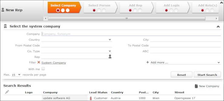 - The Add Rep phase is used to add the rep record. Data available in the person record selected in the previous step is entered automatically. You can also assign an organizational group and determines the rep’s superior and deputy.