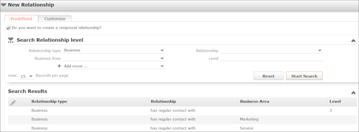The Do you want to create a reciprocal relationship? check box is enabled by default. If the type of relationship you are adding is between two companies and of the type "Parent", the reciprocal relationship is "Subsidiary" (i.e. one company is the parent company and the other is the parent’s subsidiary).