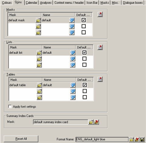 Use the Skins tab to define global color schemes (skins) for masks, lists and tables.