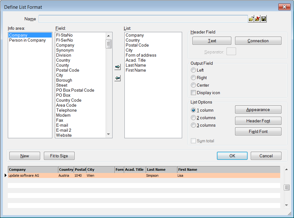 info area are displayed under Field.Note: Enable the Sort selection lists alphabetically option under Extras > Other Options in the Aurea.CRM win main module to sort the fields alphabetically.