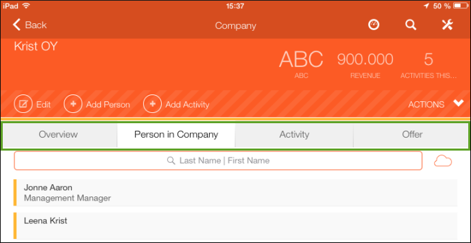 You can define that related data is displayed in a separate tab in CRM.pad by adding the desired info area in the header's Infoareas area.