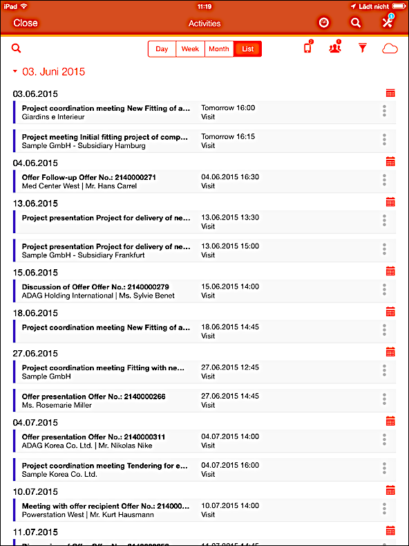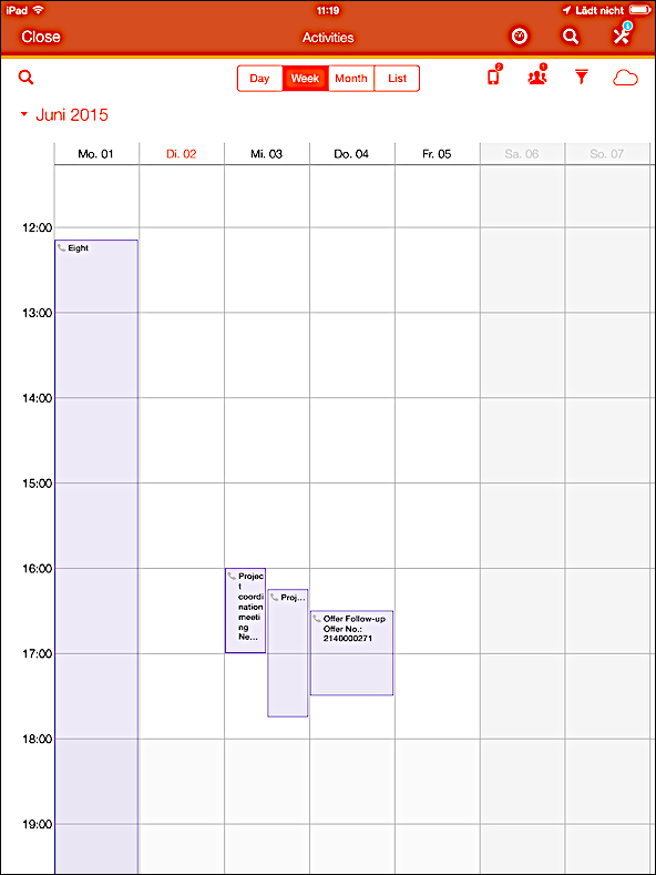 The month view is the default view and is displayed when you switch to the calendar. It shows your activities for the selected month.