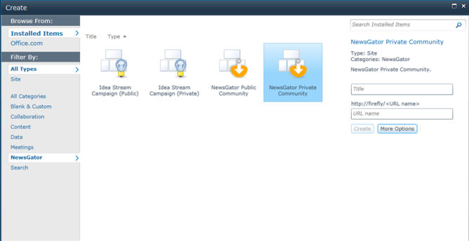 - On the following screen, select the NewsGator Private Community option and enter a name and a URL.